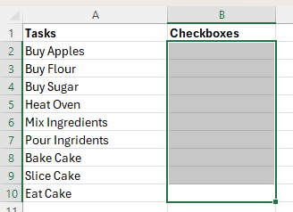 2. Select the cells where you want the checkboxes, such as B2:B10