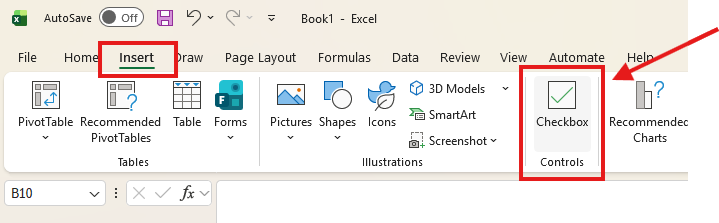 • If Insert > Checkbox is not available, your Excel version may not support this newer checkbox feature