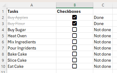 • If you want to remove the checkboxes later, select the checkbox cells and press Delete.